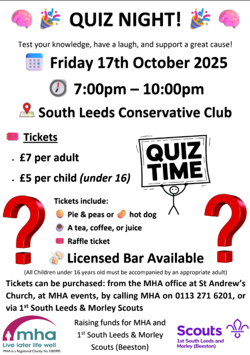 On Friday 17th October 2025, the South Leeds Conservative Club will be buzzing with laughter, trivia, and community spirit as we host our Quiz Night Fundraiser in support of MHA and 1st South Leeds & Morley Scouts (Beeston).